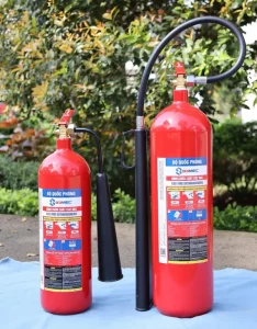 Bình chữa cháy CO₂ sử dụng khí CO₂ nén để dập lửa, thường được dùng trong các khu vực có thiết bị điện hoặc máy móc.